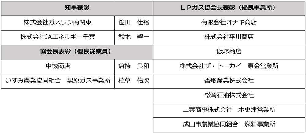 当協会からは、知事表彰の保安功労賞として卸売支部株式会社ガスワン南関東の笹田佳裕支部長と、農協支部株式会社JAエネルギー千葉の鈴木聖一支部長が受賞されました。