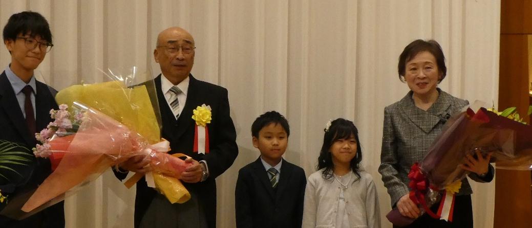 その後、小倉会長へ参加者を代表して鵜沢副会長から記念品の贈呈があり、またご家族代表してお孫様達からと協会からの花束の贈呈がありました。